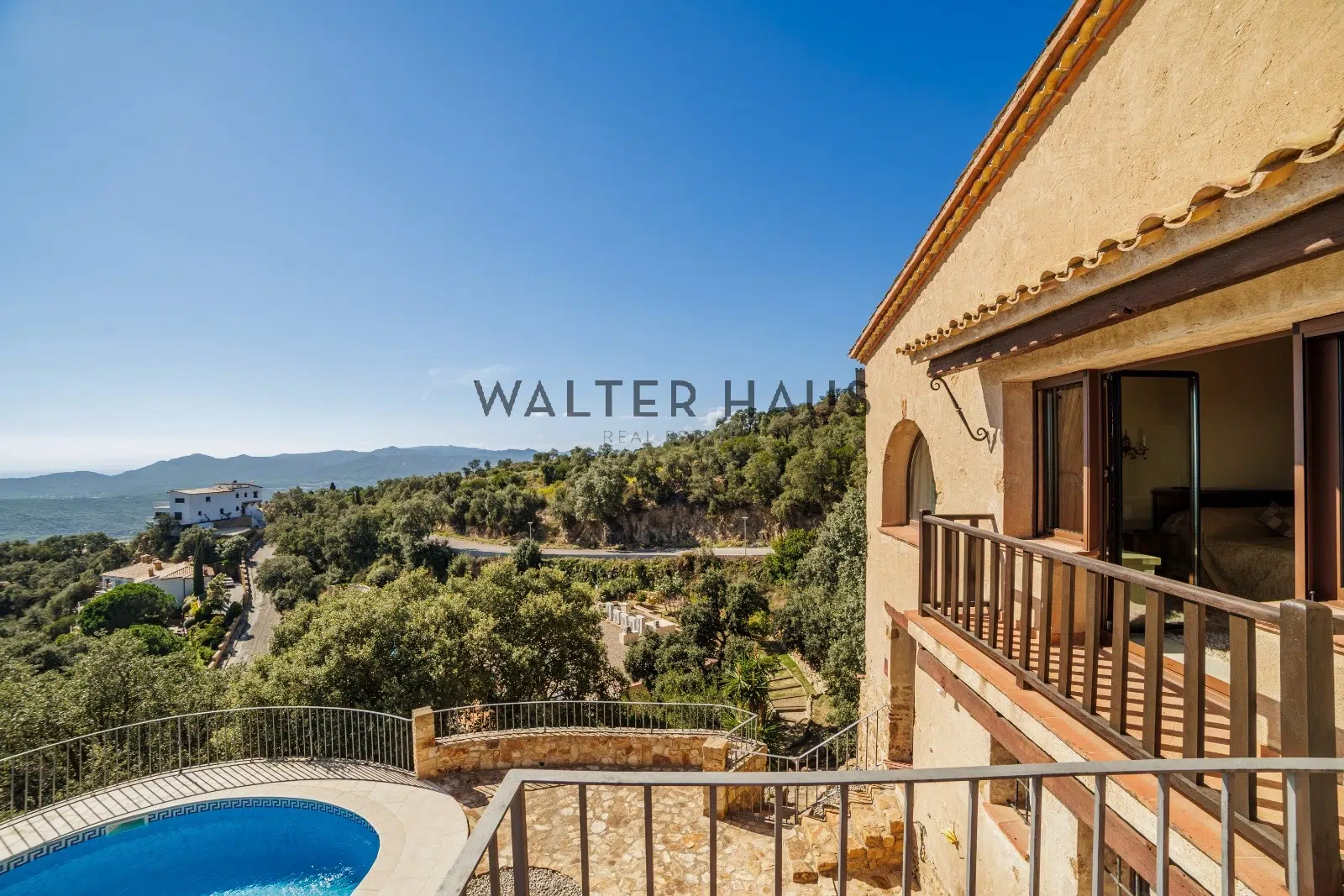 L’étage supérieur abrite une chambre avec cheminée, une salle de bains complète et une grande terrasse avec vue panoramique. Le rez-de-chaussée comprend un grand garage double, une buanderie, deux chambres avec salles de bains privatives et accès direct à la piscine, ainsi qu’une pièce polyvalente avec cuisine et salle à manger.