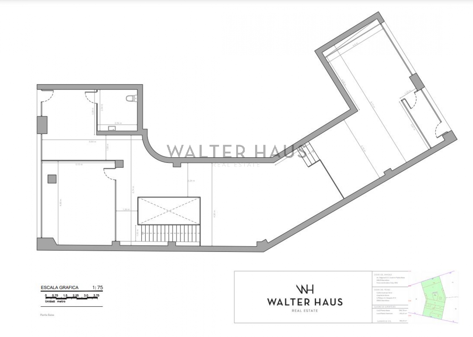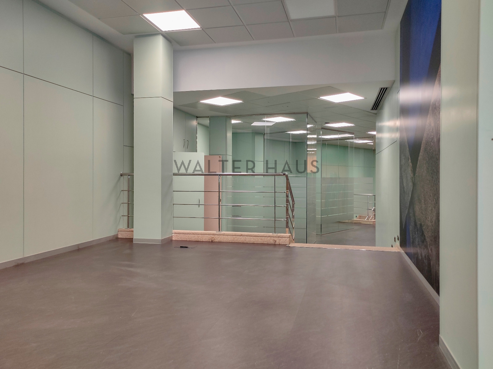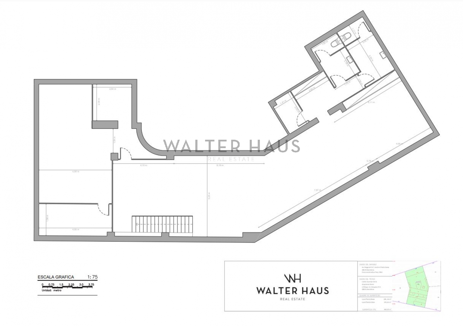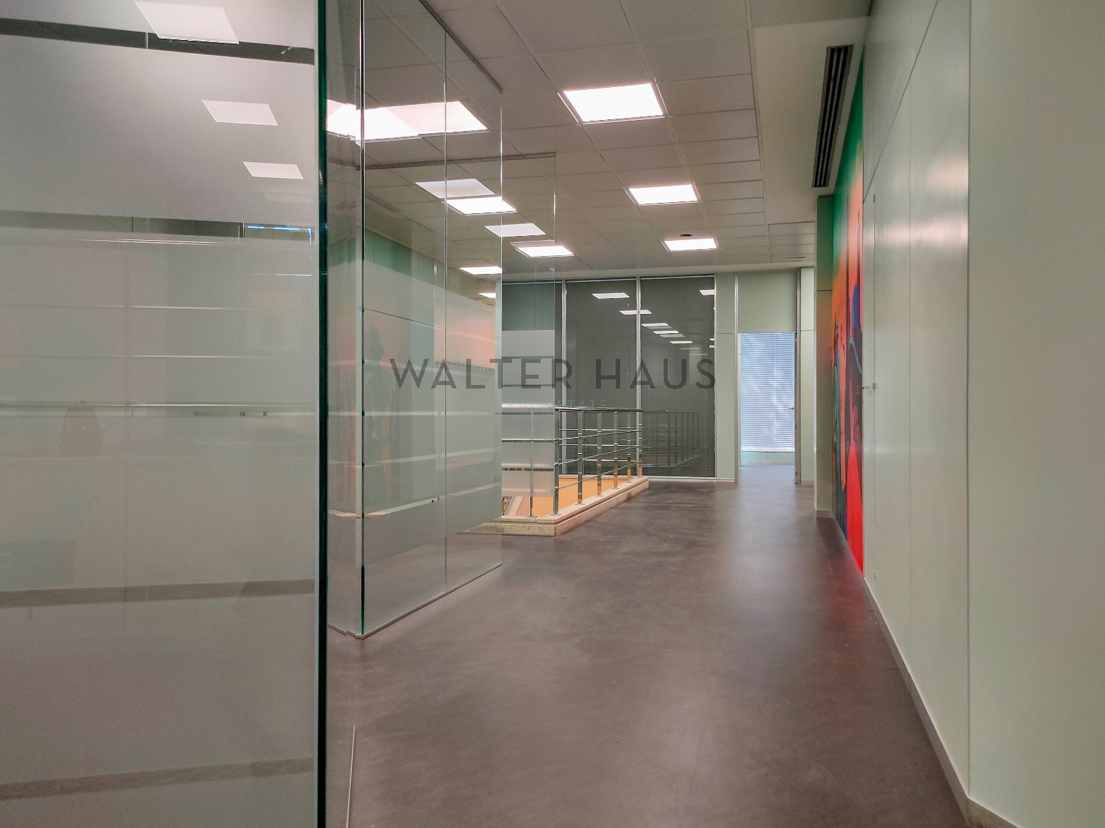 Tiene entrada tanto por Av. Diagonal como Av. Sarrià. Se distribuye en 2 plantas diáfanas. En la planta baja, de 223,52m2, hay oficinas separadas por vidrio por lo que se podría reconfigurar según necesidades y en la planta sótano, de 224,62 m2, tiene también un amplio archivo. La altura de sus techos en planta baja es de más de 2,5m de altura y en la planta principal 3m.