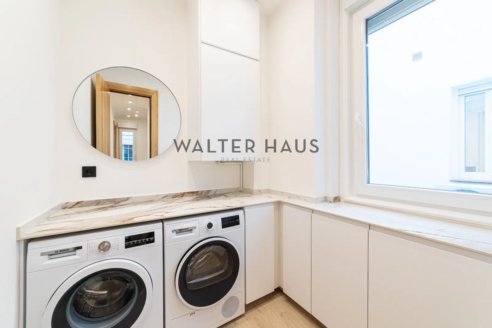 La cocina independiente ofrece gran capacidad de almacenamiento y cuenta con electrodomésticos de la marca Siemens empotrados, garantizando una estética limpia y moderna. Este espacio posee ventana propia, lo que asegura ventilación y luz natural. Anexa a la cocina se encuentra una espaciosa zona de lavandería equipada y con ventana exterior. En el área más íntima, la propiedad presenta dos dormitorios dobles en suite. La habitación principal incluye una zona de vestidor con armarios iluminados y un baño completo con doble lavabo. El segundo dormitorio también dispone de armarios revestidos con iluminación integrada y baño privado completo.