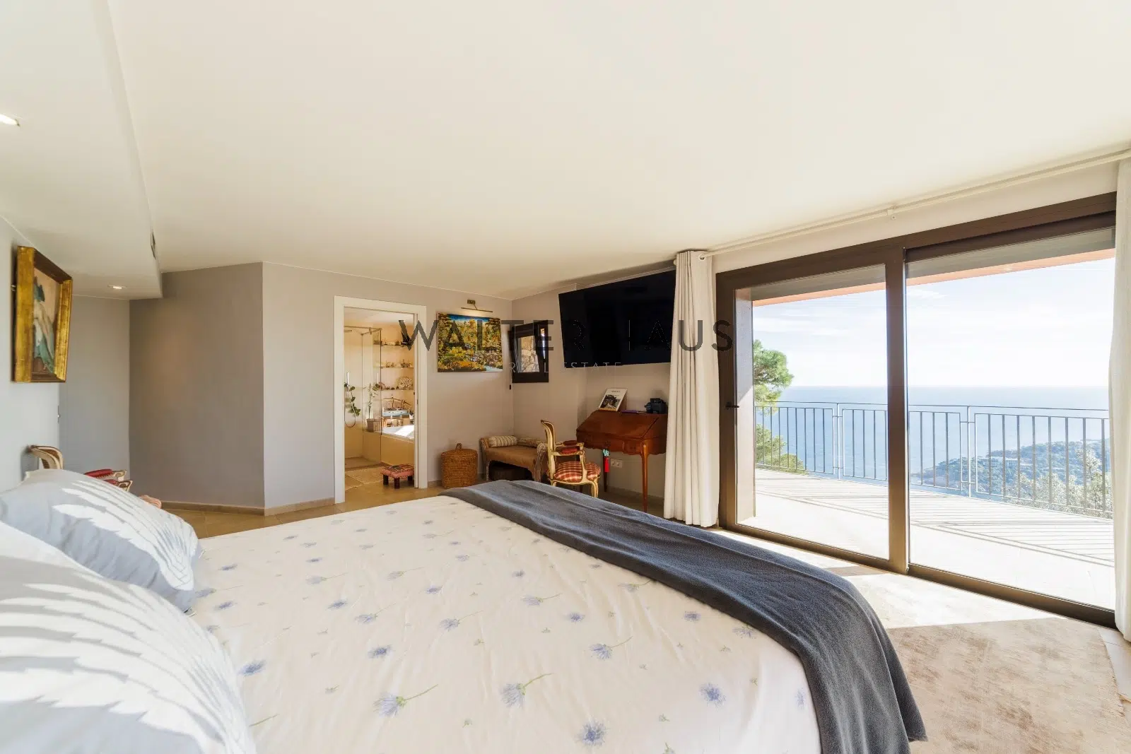 A través de un largo y señorial acceso exterior, la casa está organizada en dos plantas que aprovechan al máximo las vistas y la luz natural. La planta principal tiene un salón-comedor espacioso, con una cocina integrada que se extiende hacia el área exterior, todo con unas impresionantes vistas. Además, en este nivel hay un dormitorio con baño privado, otro dormitorio adicional, un aseo de cortesía y un trastero. En el piso inferior, el dormitorio principal con baño en suite, vestidor, zona de ejercicio y vistas al mar que hacen de este espacio algo único. En esta planta también se encuentran dos dormitorios adicionales, uno de ellos con baño privado, junto con otro baño completo y un trastero. También se accede directamente a la terraza y la zona exterior, donde se encuentra la piscina desbordante con vistas al mar.