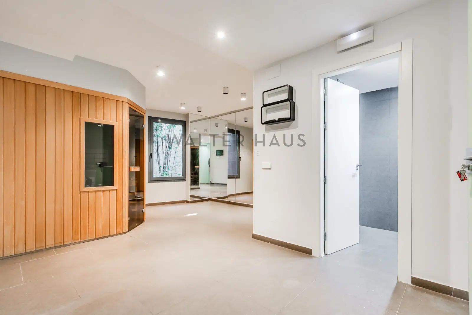 La planta inferior ofrece un sótano multifuncional que incluye dos habitaciones en suite, trastero, garaje para 3 coches, habitación de lavado y planchado, un amplio salón para películas o juegos, una zona de gimnasio y una sauna finlandesa, además de un cuarto de baño.