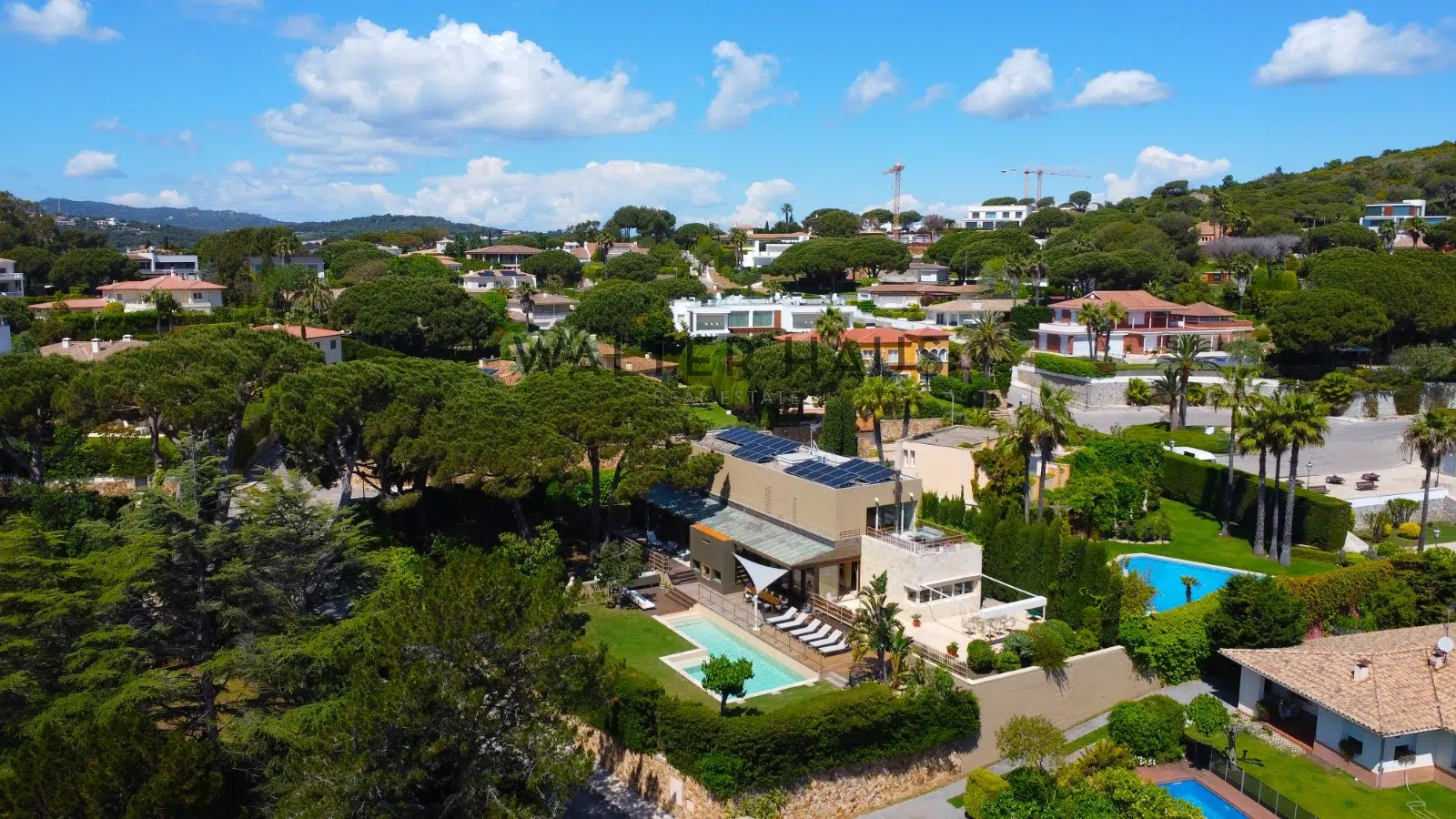 Distribuida en tres plantas, la vivienda destaca por sus espacios amplios y bien definidos. En la planta principal se encuentra un salón-comedor con salida directa a la terraza y al jardín, una cocina independiente completamente equipada, una habitación con baño en suite que actualmente funciona como despacho, y una zona de servicio con dos dormitorios y baño. La planta superior alberga cinco dormitorios y tres baños, entre ellos una suite principal con vestidor, baño privado y acceso a una terraza con vistas al mar. La planta sótano dispone de un área de bienestar con spa privado, sauna finlandesa, jacuzzi, sala polivalente y un garaje con capacidad para cuatro vehículos.