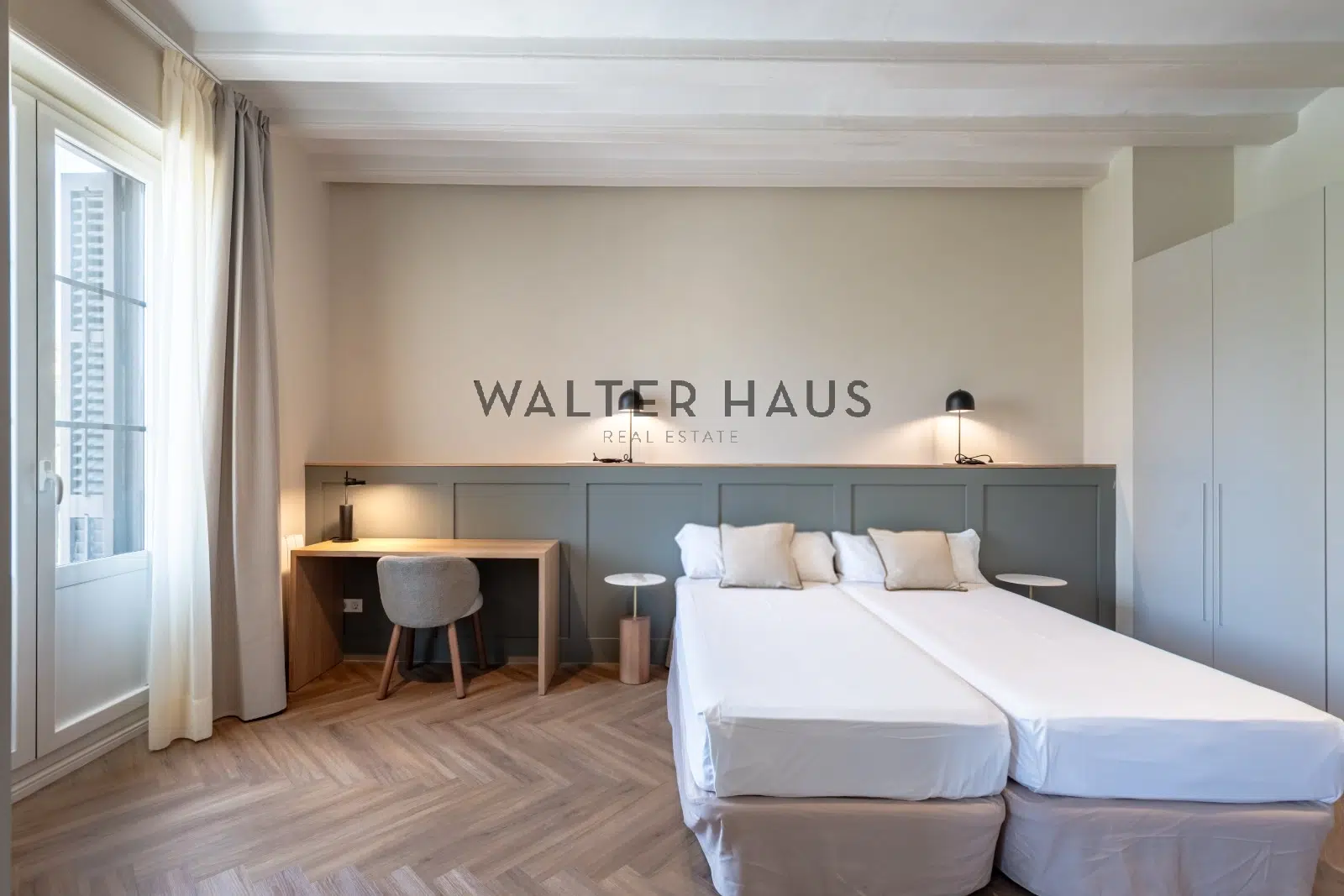 La vivienda cuenta con tres habitaciones, una de ellas tipo suite con baño privado, y dos habitaciones dobles adicionales. La cocina tipo office está completamente equipada con electrodomésticos de alta gama, ideal para el día a día o para quienes disfrutan cocinando en casa. Los acabados modernos, como los suelos de parqué en espiga y los armarios empotrados, se integran a la perfección con los elementos clásicos, creando una atmósfera cálida y funcional. Las ventanas con doble acristalamiento garantizan un excelente aislamiento acústico y térmico. Además, la vivienda tiene acceso a una espectacular azotea comunitaria con piscina, zonas chill out y vistas panorámicas al puerto y al skyline de Barcelona.