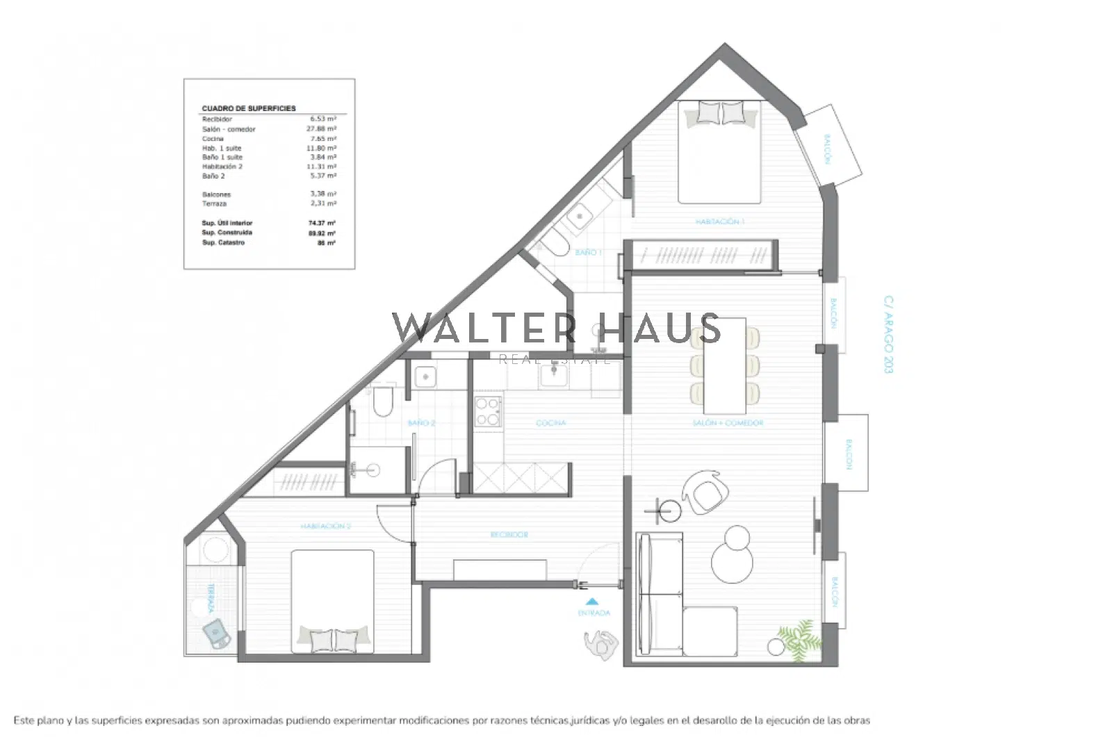 El gran salón-comedor, dispone de varios balcones exteriores que aportan luminosidad durante todo el día y crean una agradable sensación de amplitud. La cocina, independiente y funcional, está equipada y presenta un diseño contemporáneo que optimiza al máximo el espacio. Cuenta con dos amplios dormitorios dobles, uno de ellos tipo suite con baño privado, ambos con acceso directo a una terraza y un balcón, perfectos para disfrutar del aire libre en un entorno urbano privilegiado. El segundo baño completo ofrece comodidad adicional para residentes y visitas. La vivienda también cuenta con un práctico recibidor, que distribuye la zona de día y de noche de forma equilibrada, y con una superficie útil que aprovecha cada metro de la propiedad.