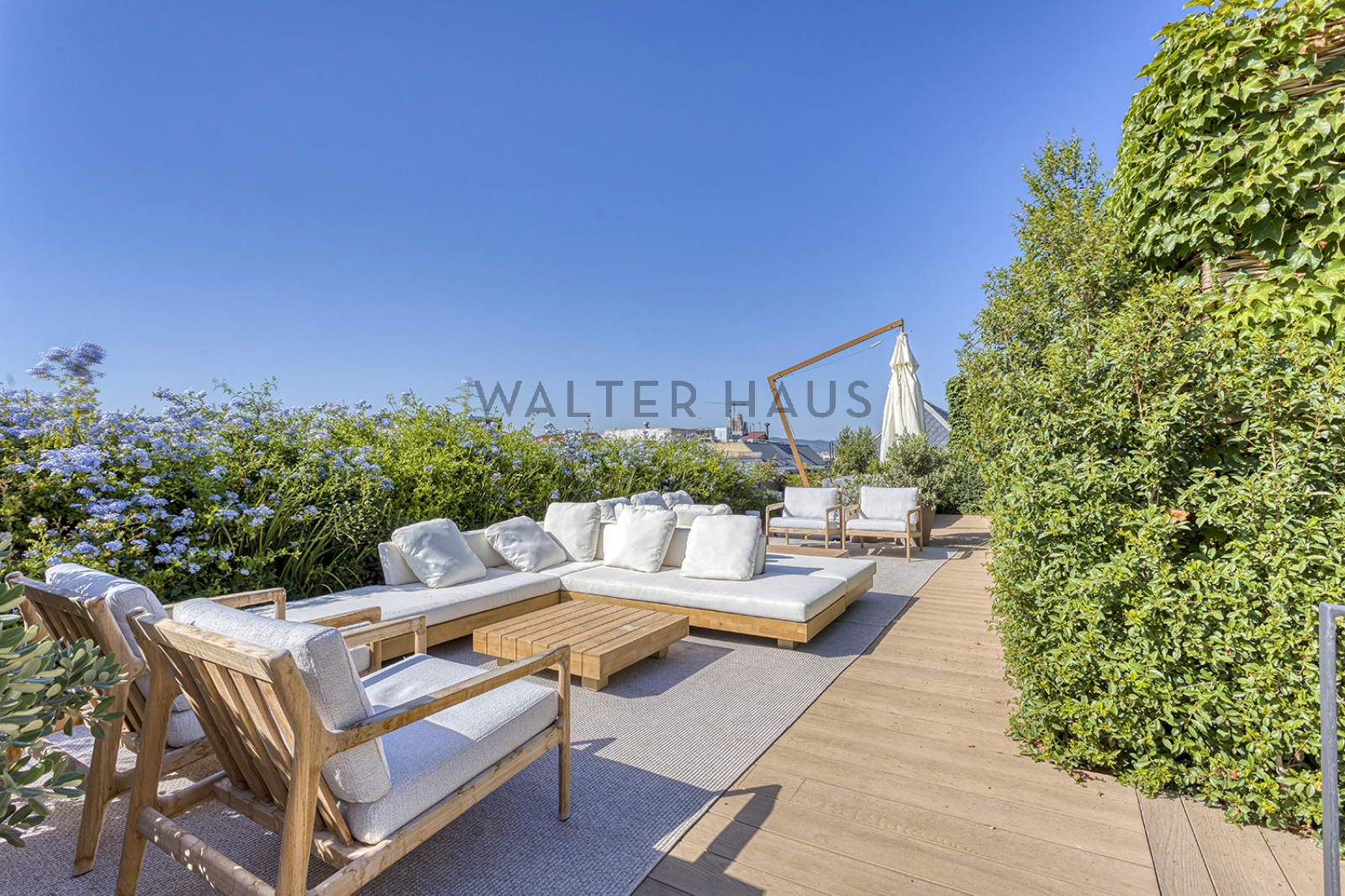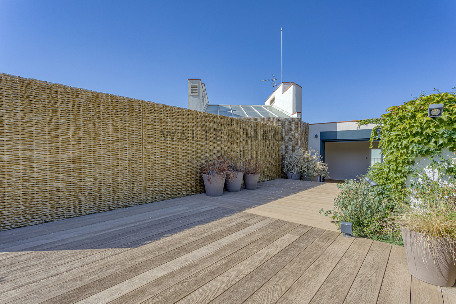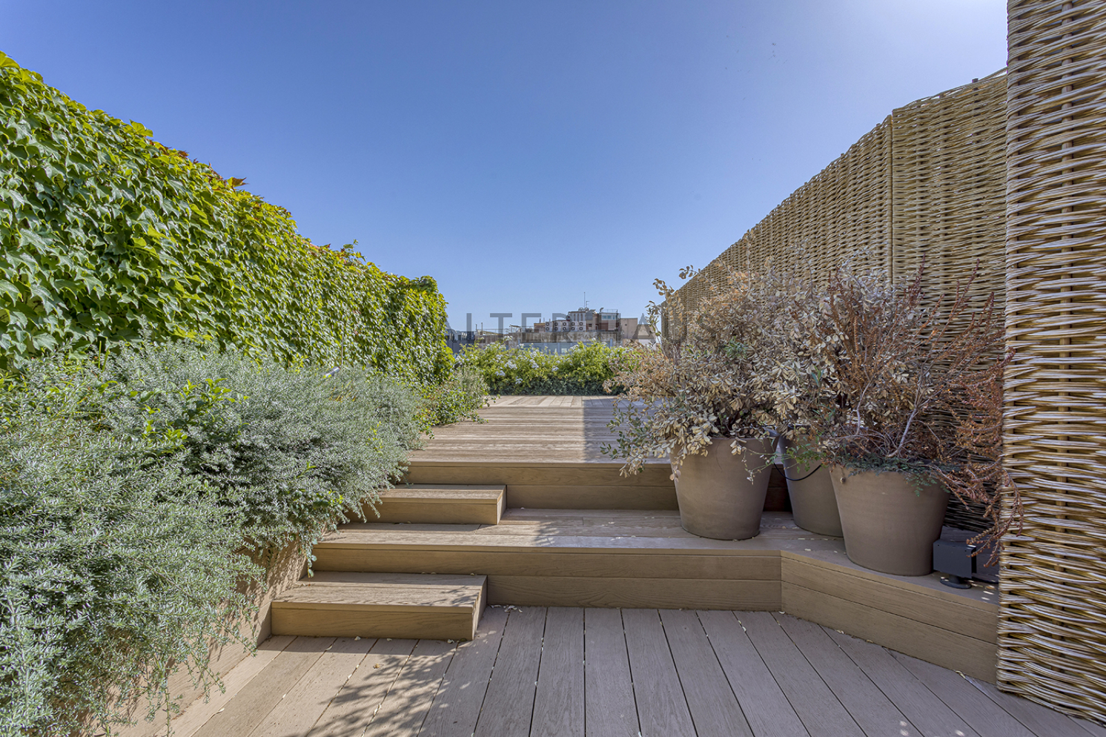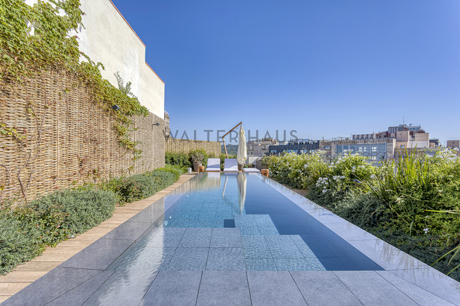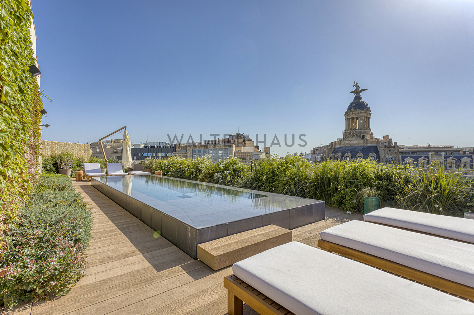 La exclusiva y elegante azotea ofrece un espacio único, con cantidad de vegetación y una estructura de madera que rodea la increible piscina, ideal para refrescarse en los meses mas calurosos.